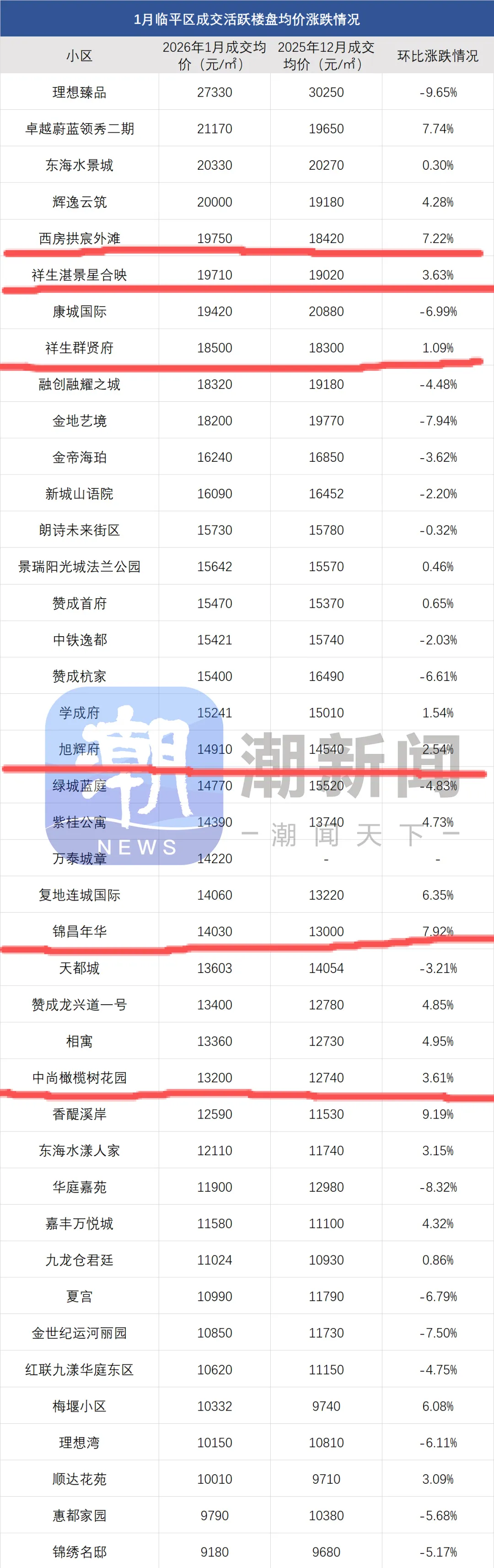 2026 年 1 月临平区成交活跃楼盘均价涨跌幅数据新鲜出炉,在这份榜单中,崇贤街道的表现格外亮眼。西房拱宸外滩、祥生湛景星合映、祥生群贤府、锦昌年华等多个小区均价环比上涨,成为板块回暖的重要信号。