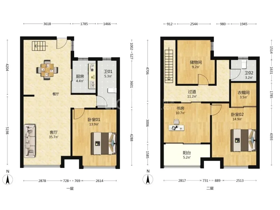 一层客餐厅,客厅35.7㎡,二层双卧+书房+衣帽间
