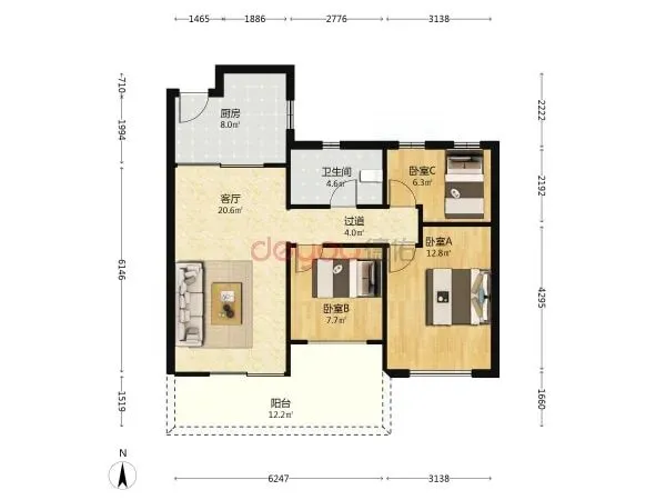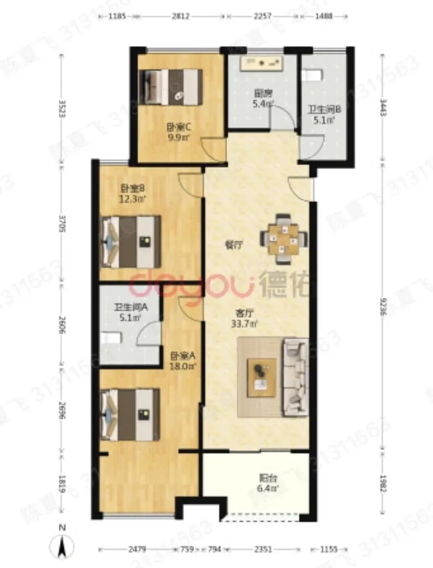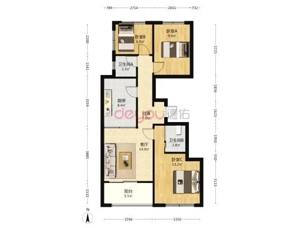 跃层,建面98.69㎡,3室2厅2卫,全明格局,户型方正