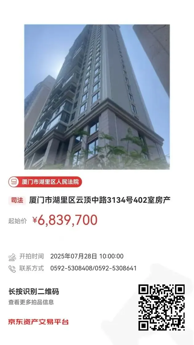 厦门市湖里法院将定于2025年7月28日(星期一)上午10时在京东拍卖平台公开拍卖:厦门市湖里区云顶中路3134号402室。