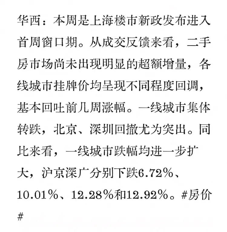 上海新政首周遇冷?二手房未现超额增量,一线城市房价集体转跌