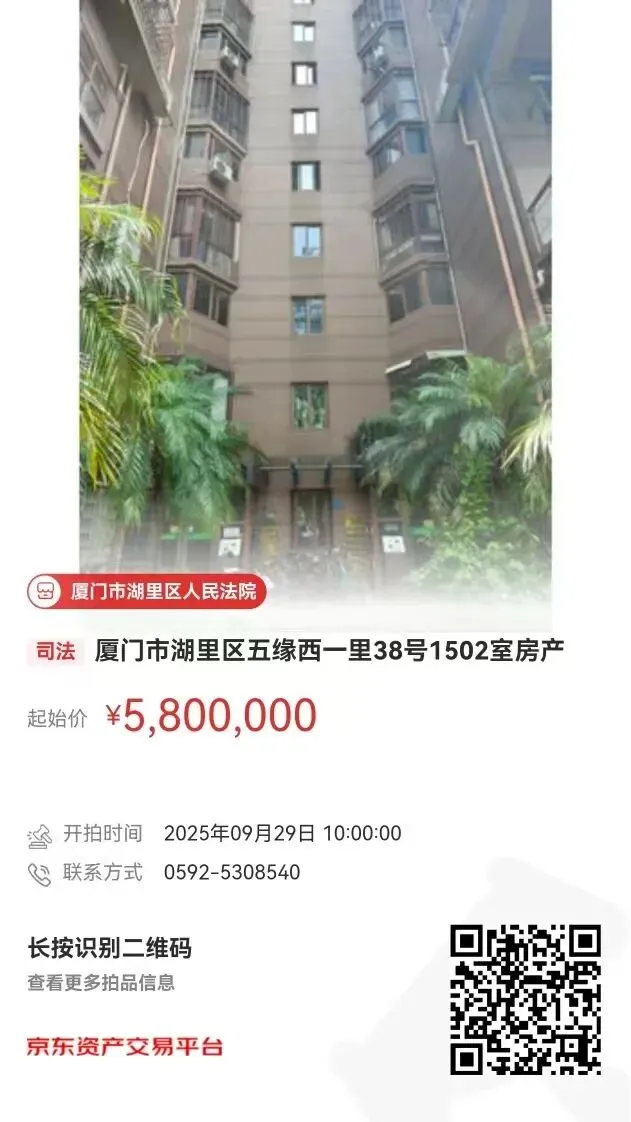厦门市湖里区人民法院将定于2025年9月29日(星期一)上午10时在京东拍卖平台公开拍卖:厦门市湖里区五缘西一里38号1502室房产。