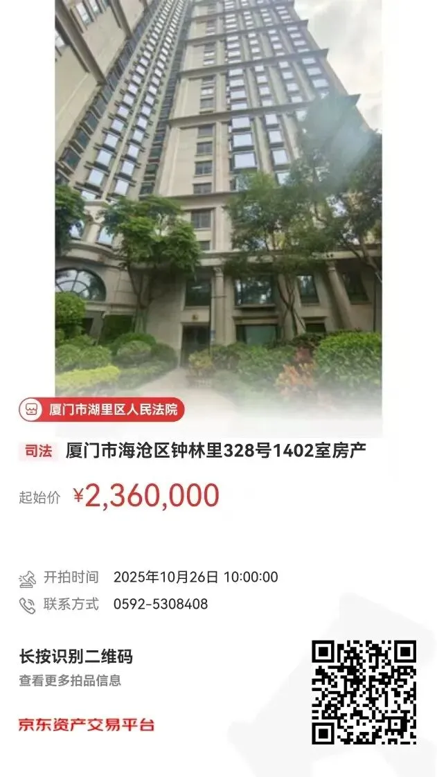 厦门市湖里区人民法院将定于2025年10月26日(星期日)上午10时在京东拍卖平台公开拍卖:厦门市海沧区钟林里328号1402室房产。