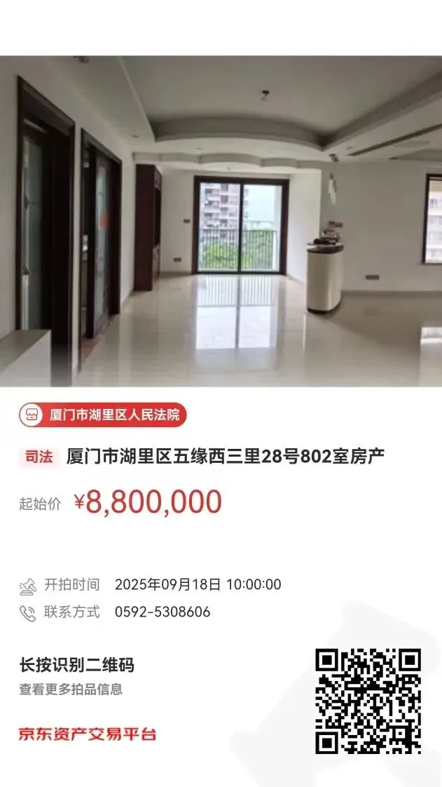 厦门市湖里区人民法院将定于2025年9月18日(星期四)上午10时在京东拍卖平台公开拍卖:厦门市湖里区五缘西三里28号802室房产。
