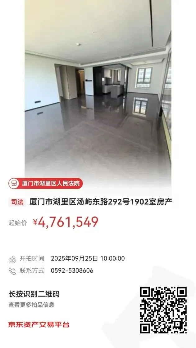 厦门市湖里区人民法院将定于2025年9月25日(星期四)上午10时在京东拍卖平台公开拍卖:厦门市湖里区汤屿东路292号1902室房产。