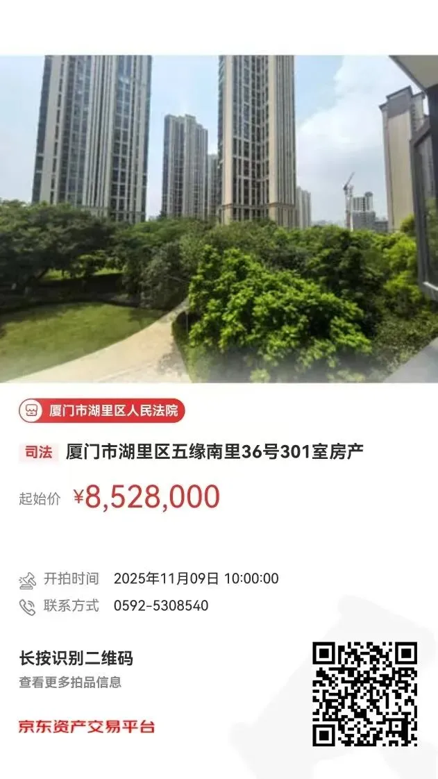 厦门市湖里区人民法院将定于2025年11月9日(星期日 )上午10时在京东拍卖平台公开拍卖:厦门市湖里区五缘南里36号301室房产。