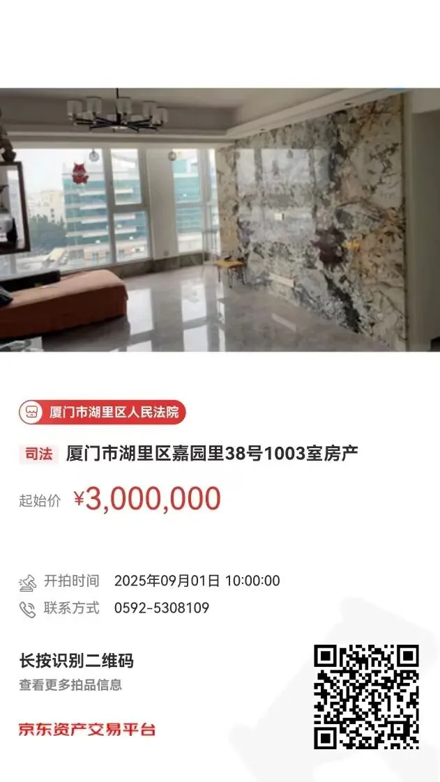 厦门市湖里区人民法院将定于2025年9月1日(星期一)上午10时在京东拍卖平台公开拍卖:厦门市湖里区嘉园里38号1003室房产。
