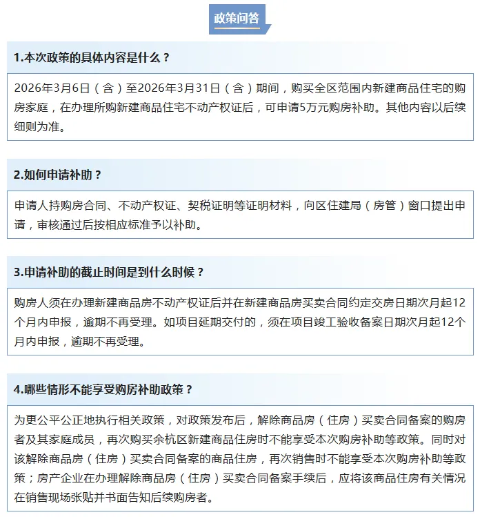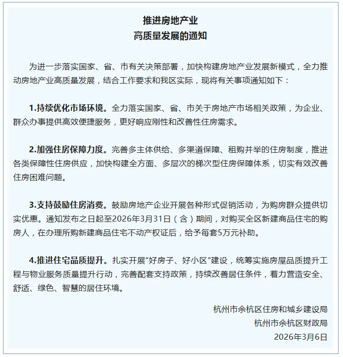 自《通知》发布之日起至2026年3月31日(含)期间,对购买余杭区新建商品住宅的购房人,在办理所购新建商品住宅不动产权证后,给予每套5万元补助。