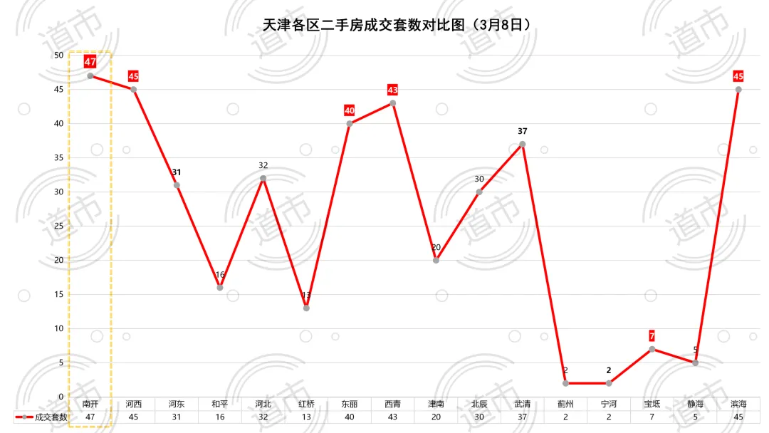 分区来看,南开区最猛,单日成交逼近50套;河西、滨海紧随其后,各自成交45套;西青、东丽也不甘示弱,单日均突破40套。