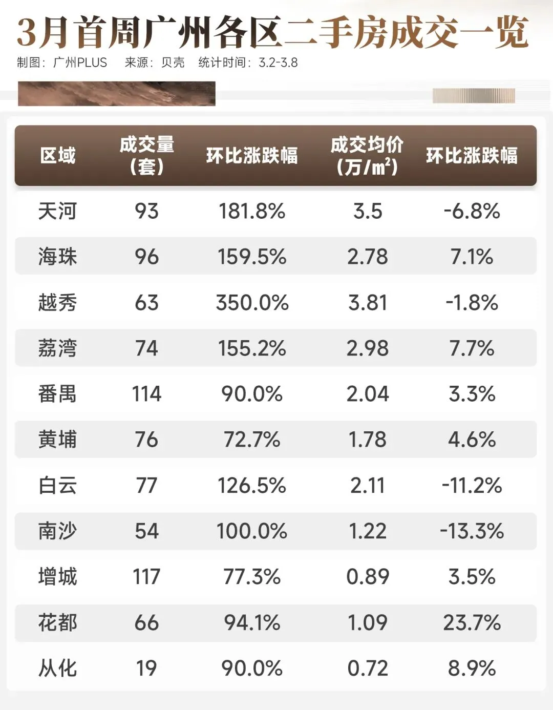 而天河、海珠、越秀、白云、花都都超过300套,其中涨幅最猛的是花都,达到了54.4%,其次是越秀涨超3成。