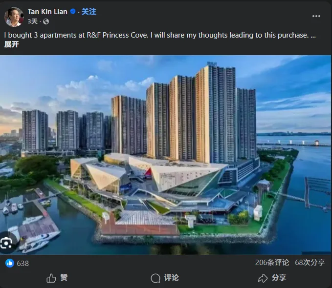 新加坡前总统候选人 陈钦亮(Tan Kin Lian) 在社交媒体透露,他在马来西亚新山一口气购买了三套公寓,而总价竟然还不到新加坡一套公寓的一半。三套房产位于 R&F Princess Cove(富力公主湾),紧邻未来新柔捷运系统 RTS 站点,交通便利、地段优越。