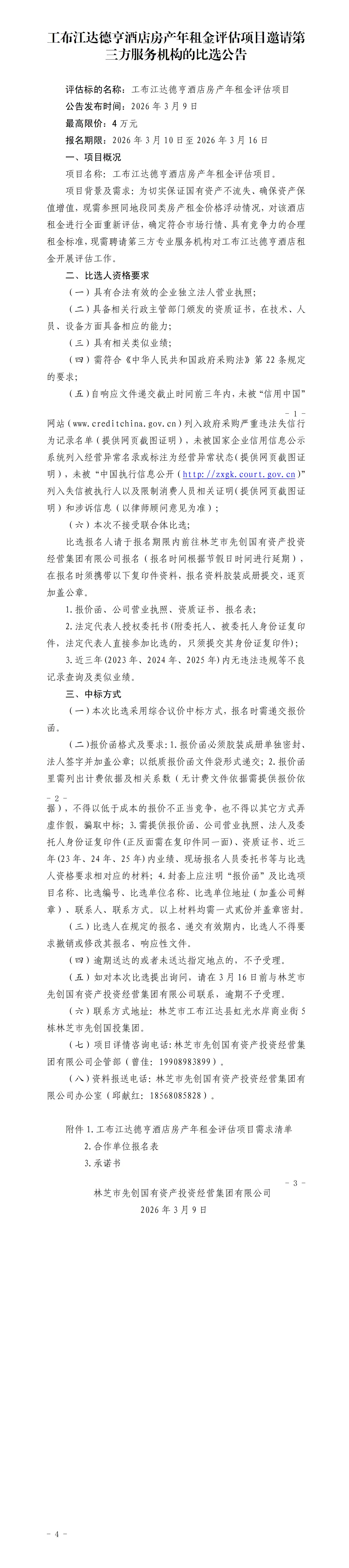 >工布江达德亨酒店房产年租金评估项目邀请第三方服务机构的比选公告