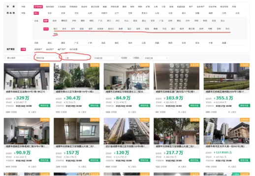 打开阿里拍卖,选择成都房源。点击"近期发布"→"即将开始"→筛选"二拍",快速锁定未来7-15天开拍的标的。