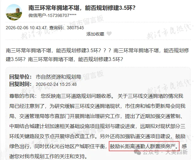 武汉南三环早晚高峰拥堵成通勤痛点,市民投诉后,官方回复 “鼓励长距离通勤者置换房产” 引发热议,网友呼吁修 3.5 环解决,也有人直言换房受多重因素制约不现实。据悉,南三环拥堵核心因光谷高新企业集聚,城南通勤族扎堆通行,产业集聚效应短期难转移,该回复也被认为是无奈之举。