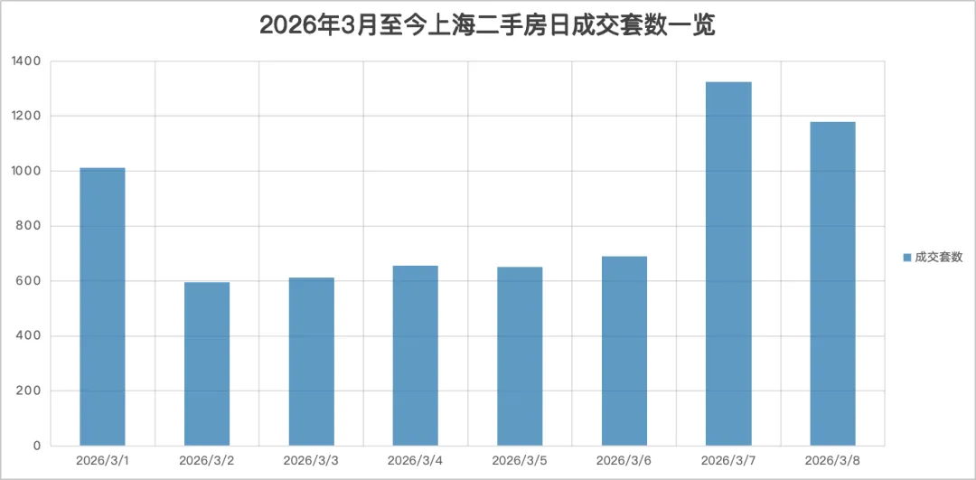 从单日成交走势来看,爆发力尤为惊人。3月7日,二手房单日网签1324套,一举创下2026年开年以来的最高单日成交纪录。这也是时隔315天,上海二手房单日成交量再度突破1300套大关,上一次还要追溯至2025年4月26日。紧接着,3月8日热度不减,单日再成交1179套,周末两天接连站上千套关口,为“小阳春”行情打下坚实基础。