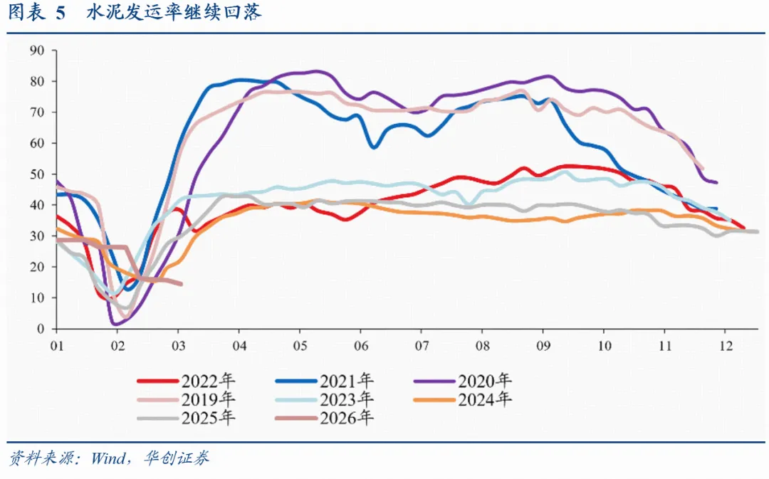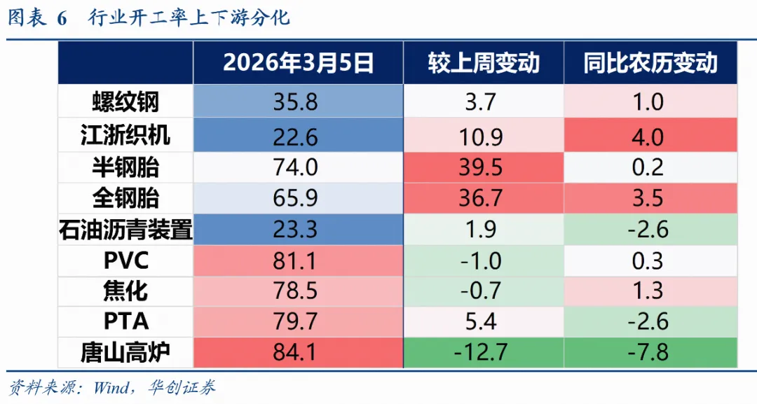2、基建:高频数据仍在低位。水泥发运率偏弱。截至3月6日,水泥发运率为14.5%,较2月27日下滑约1个点,较去年农历同期高0.5个百分点。石油沥青装置开工率继续回落,截至3月4当周,开工率为23%,较上周环比+1.9个点,较去年农历低2.6个点。