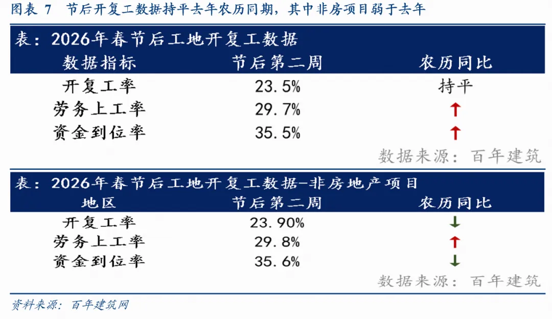 2)节后开复工数据:据百年建筑调研,截至3月4日(农历正月十六),全国201家建筑施工头部企业(24年187家,25年222家)共10692个工地(24年10094家,25年13532家)开复工率持平去年农历同期,劳务上工率和资金好于去年农历同期。开复工率方面,房地产项目略好于去年农历同期,非房地产项目弱于去年农历同期。