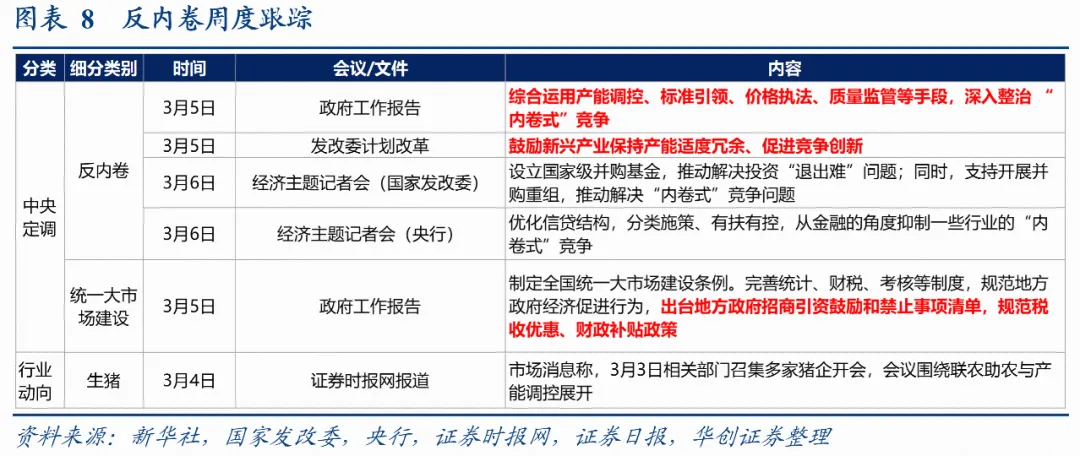 反内卷跟踪:以中央定调为主。政府工作报告提出,“综合运用产能调控、标准引领、价格执法、质量监管等手段,深入整治‘内卷式’竞争”。国家发改委计划报告提出,“鼓励新兴产业保持产能适度冗余、促进竞争创新”。