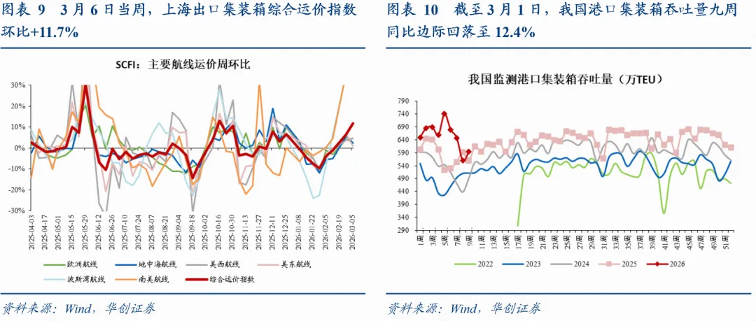 中国出口运价:地缘局势急剧升级。运输市场面临考验。3月6日当周,上海出口集装箱综合运价指数环比+11.7%,上周为+6.5%。分航线来看,欧洲航线方面,本周运价未明显受到中东局势的影响,环比+2.3%,前值为+4.3%。北美航线方面,本周美西、美东航线运价环比分别为+4.5%、+1%,前值分别为3.9%、6.6%。