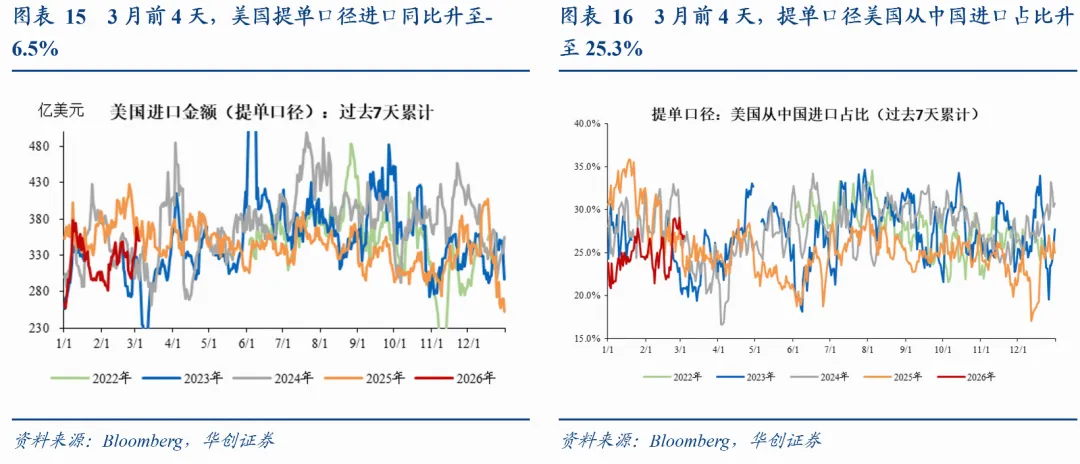 美国进口:水运提单进口降幅缩小;从中国进口占比回升。年初至3月4日,美国提单口径进口同比-11.5%,其中3月前4天同比为-6.5%,1-2月同比为-11.8%;美国提单口径从中国进口同比-25.3%,其中3月前4天同比为21.1%,1-2月同比为-27.4%;提单口径美国从中国进口占比24.9%,其中3月前4天占比为25.3%,1-2月占比为24.8%。