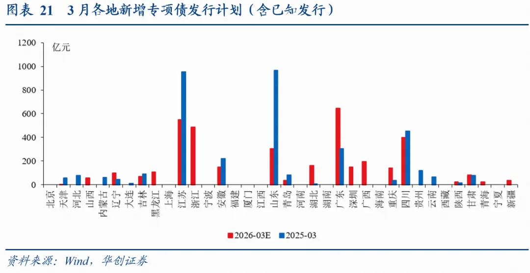 新增地方债发行计划更新:3月9日当周计划新增发行地方债371亿,其中一般债194亿,专项债177亿;截至3月6日,吉林、上海等30省市披露了2026年3月新增专项债发行计划(含已知发行)3708亿(2025年同期,已披露地区实际发行3575亿),披露了26Q1新增专项债发行计划共11932亿(2025年同期,已披露地区实际发行9316亿);1-2月新增专项债累计发行8242亿,去年同期为5968亿。