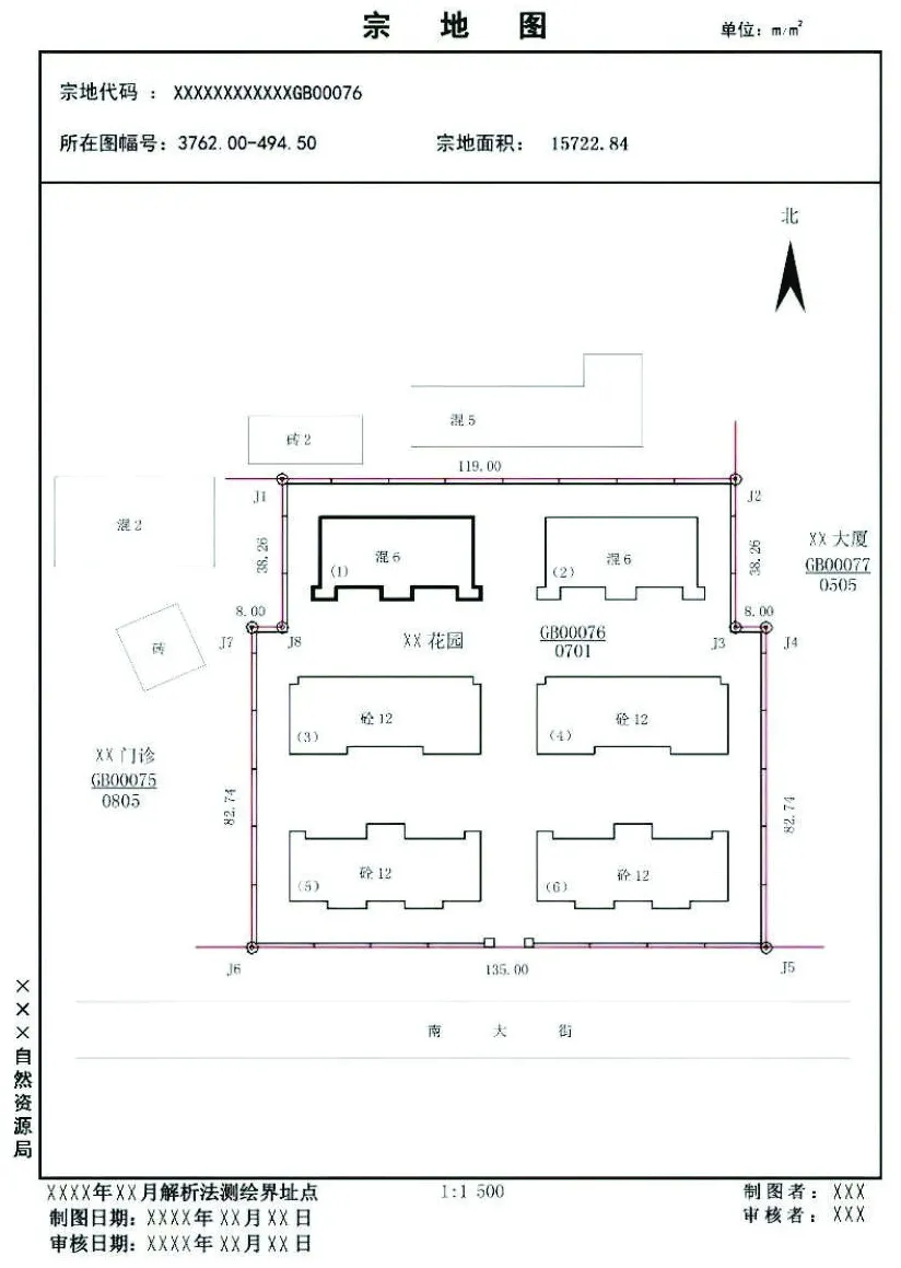 (5)宗地内的地类界线、房屋、构(建)筑物及宗地外紧靠界址点、界址线的定着物、邻宗地的宗地号及相邻宗地间的界址分隔线;