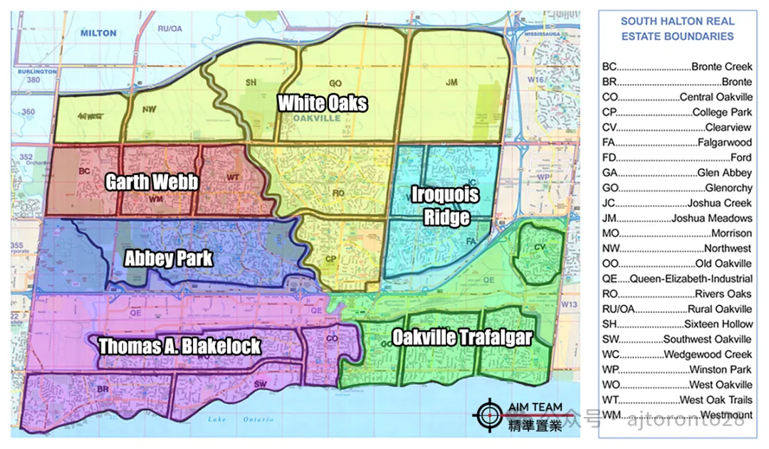 我还是一如既往地将两个系统的社区、学区分布图介绍如下,好让大家熟悉两个地产局的社区分布区别。北边的经纪会使用TRREB的分布多点,还是我说的,有时候TRREB的社区分布不符合Oakville的实际情况,使得一个社区跨两个学区的情况发生。