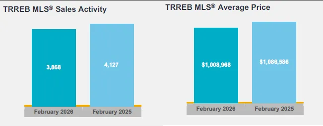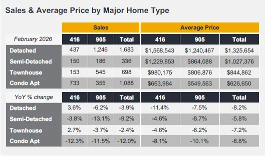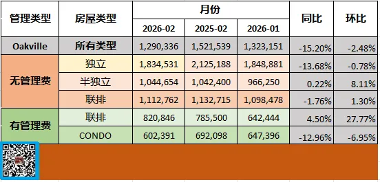 由于两个地产局的分区不同,特别是有些TRREB的社区分跨两个学区,我会依据下面的原则进行粗略的划分,大家对应着去看(注意:OMDREB 的社区虽然有些与OMDREB的名字相同,但OMDREB的是加了数字编号在前面的)。我会将OMDREB的Clearview, Ford, Morrison和Old Oakville以及TRREB的Clearview,Eastlaske和Old Oakville (注意:这里的Old Oakville有部分地址是属于TAB高中的)统计到OT高中。我会将OMDREB的Joshua Creek,Wedgewood Creek, Falgar Wood 以及TRREB的Iroquois Ridge North和Iroquois South统计到IR高中。我会将OMDREB的Glen Abbey 以及TRREB的Glen Abbey 统计到AP高中。我会将OMDREB的West Oak Trails ,West Mount 和Bronte Creek 以及TRREB的West Oak Trtails ,Palermo West统计到GW高中。我会将OMDREB的College Park,River Oaks, Joshua Meadow, Glenorchy,Sixteen Hollow, North west以及TRREB的College Park、River Oaks、Uptown Core和 Rural Oakville统计到WO高中(注意:这里有部分成交实际是属于IR高中的。)我会将OMDREB的South West,West Oakville,Central Oakville 和Bronte 以及TRREB的Bronte East,Bronte West 统计到TAB高中(不过这里缺失部分TRREB定义的Old Oakville的数据)当然,由于Oakville人口增长快速,学区的划分也有临时性的选择,特别是新高中还没有投入使用之前,大家居住的地区所对应的高中,可以到教育局的网站详细了解。TRREB发布的2026年02月份月报显示:大多伦多地区的2026 年02月房屋销售量同比减少6.3%;平均价格同比下降7.1%。相对01月份的同比百分比数据略好。环比方面:对比01月份成交上升明显,从3082宗至3868宗,成交量增加25.50%;价格从01月的973,289加元至1,008,968加元,价格增长3.67%。下面我们来看看各种房屋类型的同比数据:独立屋同比销售减少3.9%,为1683套,价格下降8.2%,达到了$1,325,654加元;半独立屋销售同比减少9.2%,为336套,价格下降5.8%,达到$1,027,376加元;联排的销售同比减少2.4%,为698套,价格下降7.2%,为$844,862加元;公寓销量同比减少12.0%,为1088套,价格下降8.8%,至$626,650加元。环比数据如下:独立屋从01月的1352套增加到1683套,销售增加24.48%,价格从01月的$1,277,915至$1,325,654,价格增长3.74%;半独立屋销售从01月的278套增加到336套,销售增长20.86%,价格从01月的$945,967加元增长到$1,027,376加元,价格增长8.6%;联排的销售从01月的552套至698套,销售增加26.45%,价格从$819,543加元至$844,862加元,价格增长3.09%;公寓从01月的856套至本月的1088套,销售增加27.1%,价格从01月的$604,759加元至$626,650加元,价格增长3.61%。从数据来看:市场2026年02月份虽然比2025年销售减少,但相对1月份的销售量和价格都有明显增长,特别是联排和公寓,从一个角度说明,市场的刚需是明显的,信心也在逐步恢复。在多伦多地产局(TRREB)放盘的Oakville的成交数量是156宗,成交平均价1,325,963加元,中间价1,180,000 。从平均价和中间价的差值来看,中低价的房屋成交量大,但高端房屋成交金额大,这也和Oakville的主要房屋是独立屋相关。对比01月的数据:在多伦多地产局(TRREB)放盘的Oakville的成交数量是105宗,成交平均价1,330,082加元,中间价1,120,000 。从环比数据来看,成交量巨量增长48.6%,平均价减少0.31%基本持平;中间价增加5.4%。平均价基本持平和中间价上升了一个中位数,说明房屋的价格重心正在上移,也是一个好的兆头,大家继续阅读,我会在房屋类型中详细分析。前面已经说过,根据数据分析,刚需是明显的。从一个角度证明加拿大房屋危机的存在是由来已久的,任何政府都不能一蹴而就。我对买家的建议是:能捡到便宜就偷着乐,是不是捡到便宜是要看相对市场价便宜而不是砍了多少来决定,这就要找到可信任的专业经纪来分析数据。我对卖家的建议还是能不卖就不卖吧,能找到比房屋更好的投资再说。大家可以关注我的微信公众号ajtoronto28和我的朋友圈,密切观察市场的发展变化。04