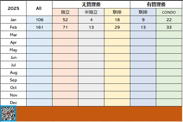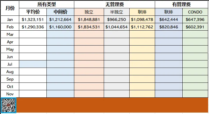 从房屋类型的价格对比来看,半独立屋和有管理费的联排的升势巨大,成交量较小,分别为13宗和13宗(具体成交量同比环比请看下表),相对成交升幅较大,估计是成交价达到或者接近卖家的期望值所致,公寓仍然跌跌不休,而且成交还放大,说明公寓卖家已经非常疲惫了。对比12月、01月的数据:我会说随机性比较大,各类房屋此起彼伏,本公众号提供数据供大家观察和参考。请跟随我的公众号月报!2月份成交环比升幅巨大为51.89,我对比 了一下去年2月份的环比,成交是从139 到149宗,升幅仅7.2%,是不是市场转暖的迹象?请跟随我的微信公众号月报密切观察。过去三个月的总共下降6.7%,主要来自12月份的5.29%的大幅下降。但11月相对10月上升了2.68%。从数据来看,市场波动比较大,这和大家的心态不稳有关,也和市场成交量稀少,导致数据离散性大有关。从目前市场严重缩量,价格小幅震荡的态势来看,是筑底过程的体现。从2月份的数据来看,有刚需买房的人正在尝试进入,与我上个月的建议【有刚需买房的人可以尝试进入,抱着能捡到便宜就快手捡的态度,同时也要换位思考 卖家的心态。抱着能捡到便宜就快手捡的态度,同时也要换位思考卖家的心态。】结果相符。按现在的利率计算,租房和买房是同等支出,为什么不给自己一个成为屋主的机会呢?我还是想反复地说:市场变化是洗牌的过程,也是贫富分化过程。有市场触觉的人总是这个世界的赢家,从而成为有钱的人。有一本书叫做【少有人走的路】,我们能不能走那条少有人走的路,全在我们的认知、勇气和胆识。大家都知道黎明前是最黑暗的时期,也是最容易失去信心的关键。在大多数人都丧失信心的时候,正是事情的转折点。许多卖家已开始从出售转出租,包括我自己和一些我的客人。相信市场上的房源减少后会迫使买家出手快点。不管事情发展如何,做好自己的决定,并平静地接受自己做决定导致的结果,任何自责或怨天尤人都于事无补。随着成交量的下降,数据的离散性也在增加。大家密切关注市场的变化吧!根据自己近期的地产经纪业务日常工作来看,有钱且想买的人还是不少,只是对市场缺乏信心,在犹豫中不肯出手,想捡漏是个普遍心态。我的意见是有漏就快捡,毕竟市场变化没有人说得准。现在会不会是黎明前的黑暗呢?成交量和稀少从一个角度说明了卖家、买家期望值严重不匹配导致。大家都要进行调整才有可能成交。大家换位思考一下也许对大家都有益处。OMDREB 与TRREB合并后,到现在已经一年了,终于有同比、环比的数据了,只是比以前少了社区数据(原因是两者的社区划分不同,无法按社区统计),不过也没关系,市场成交稀少,随机性太大,按社区分目前意义不大。集多年买房卖房、重建翻建、房屋装修、Legal 单位申请、出租等丰富经验于一身。并一向以精准的投资眼光,帮助客人沙里淘金。专业诚信,精准到位!更多信息请浏览我们的网页:https://www.aim-team.com/《安居多伦多》是一个立足于多伦多房地产信息,并涵盖日常生活趣事,人文,地理,社区知识,学区知识,税务法律知识,小说,散文,人生感悟,美食制作,美食介绍等内容的原创公众号,其宗旨是帮助朋友们更多地了解多伦多的方方面面,在移民前能明确方向,移民后能快速站稳脚跟,做一个平凡的多伦多人,享受美好生活的点点滴滴。