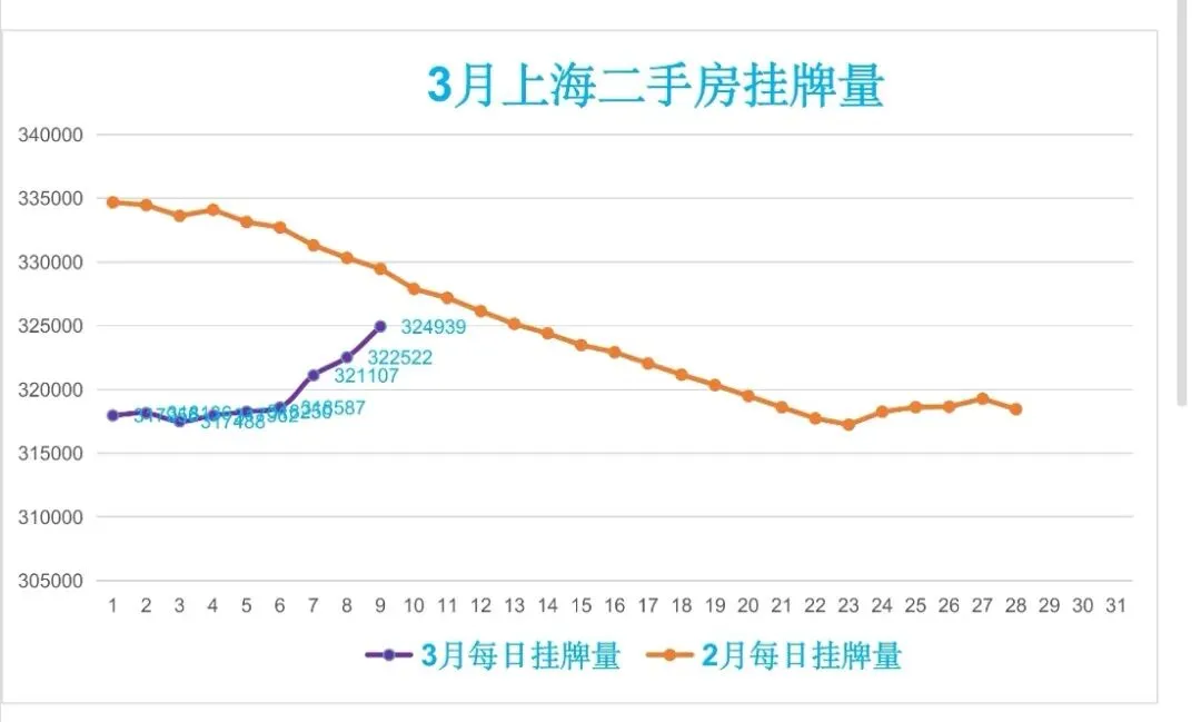 🏠昨日(3月9日,周一)挂牌324939笔,较前一日增加2417笔,日均挂牌319660笔,约31.97万笔,挂牌与实际成交比379:1,去化周期约12.6个月。