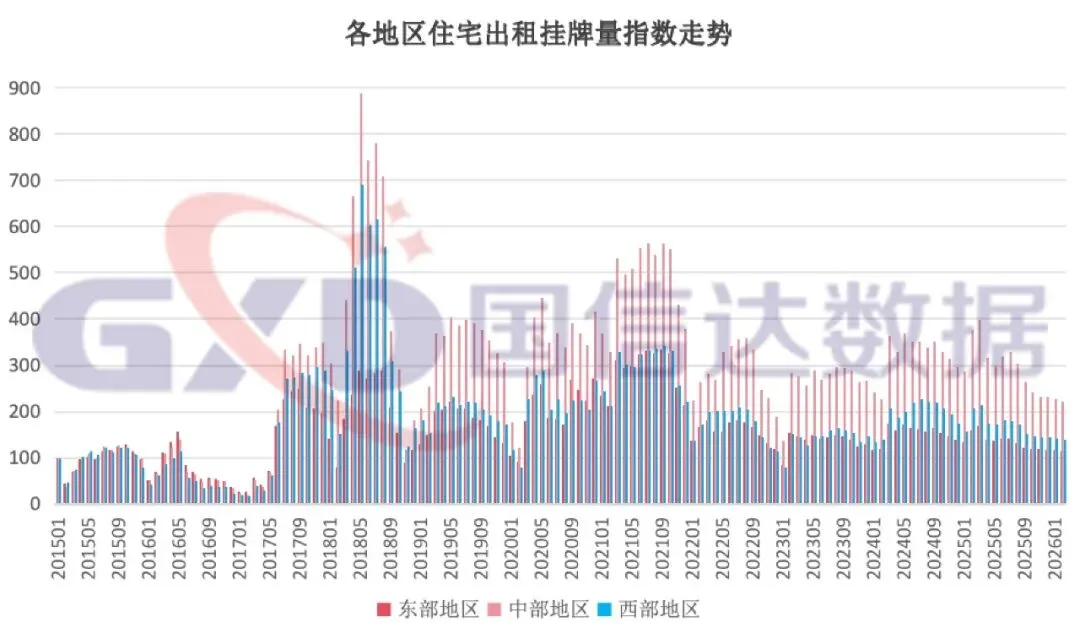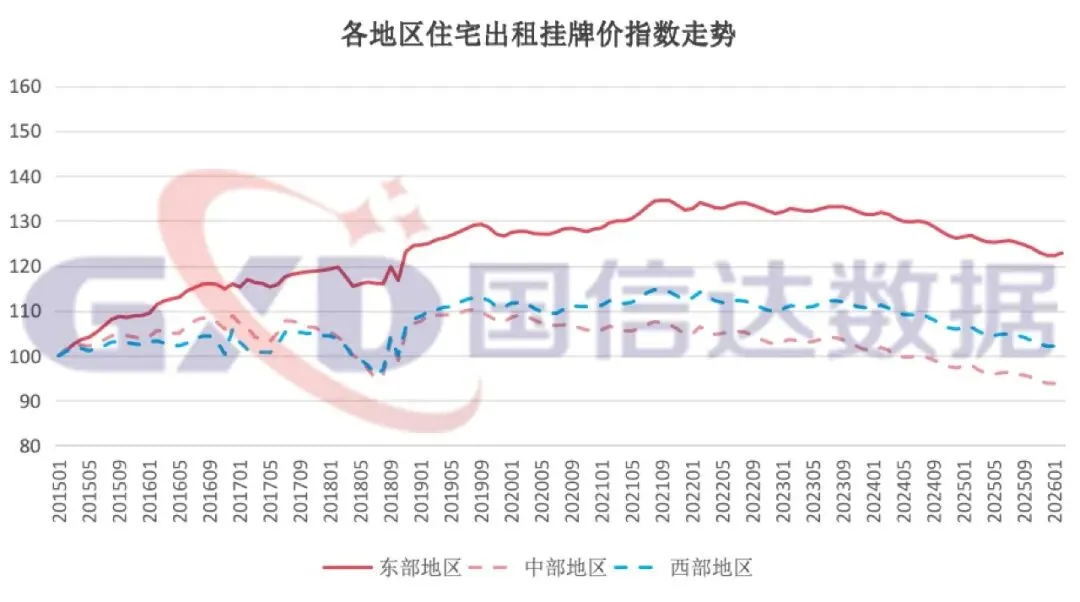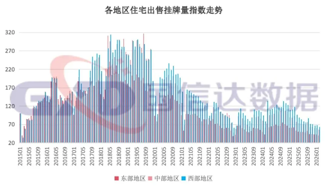 从出售挂牌价指数看,中、西部地区均环比上涨,涨幅分别为0.53%、1%,东部地区环比下降,降幅为0.32%。从出售挂牌量指数看,东、中、西部地区均环比下降,降幅分别为6.35%、6.4%、6.86%。
