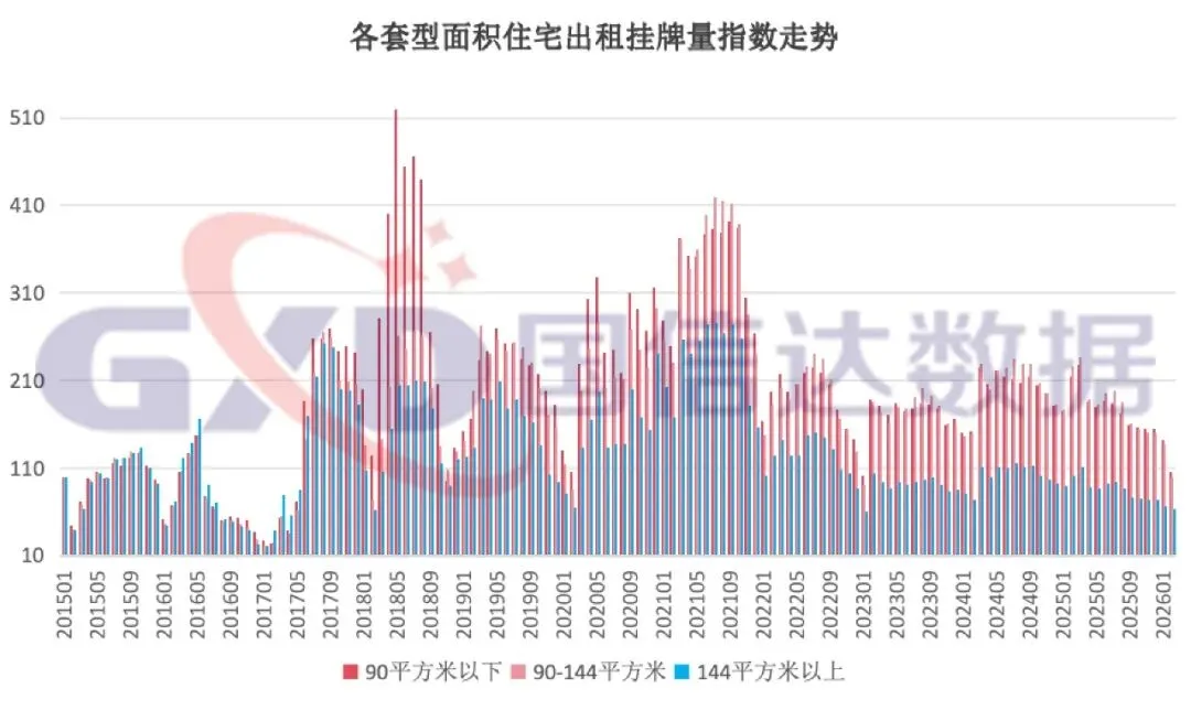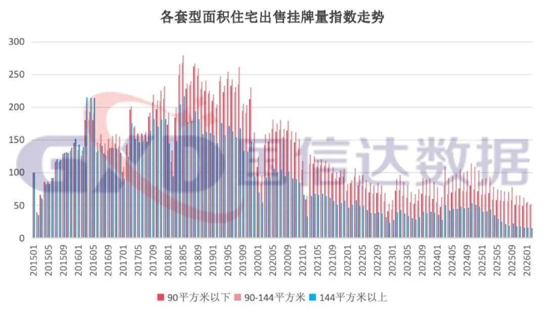 从出售挂牌价指数看,90平方米以下、90-144平方米、144平方米以上套型面积均环比上涨,涨幅分别为0.13%、0.2%、0.22%。从出售挂牌量指数看,90平方米以下、90-144平方米、144平方米以上套型面积均环比下降,降幅分别为7.48%、6.71%、7.25%。