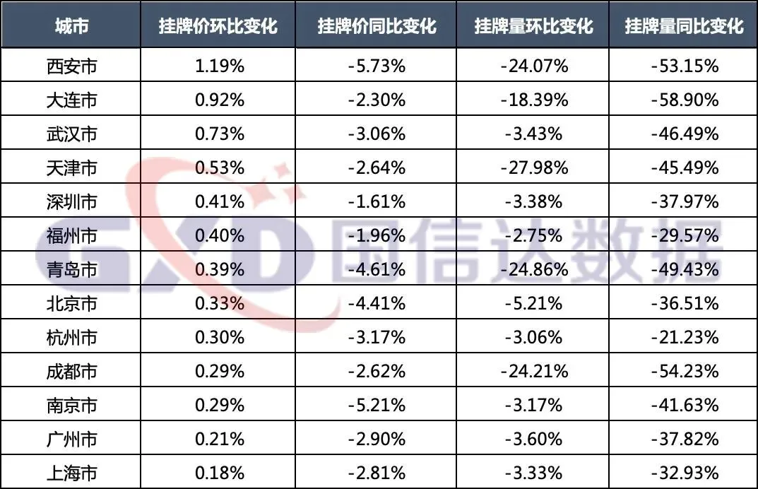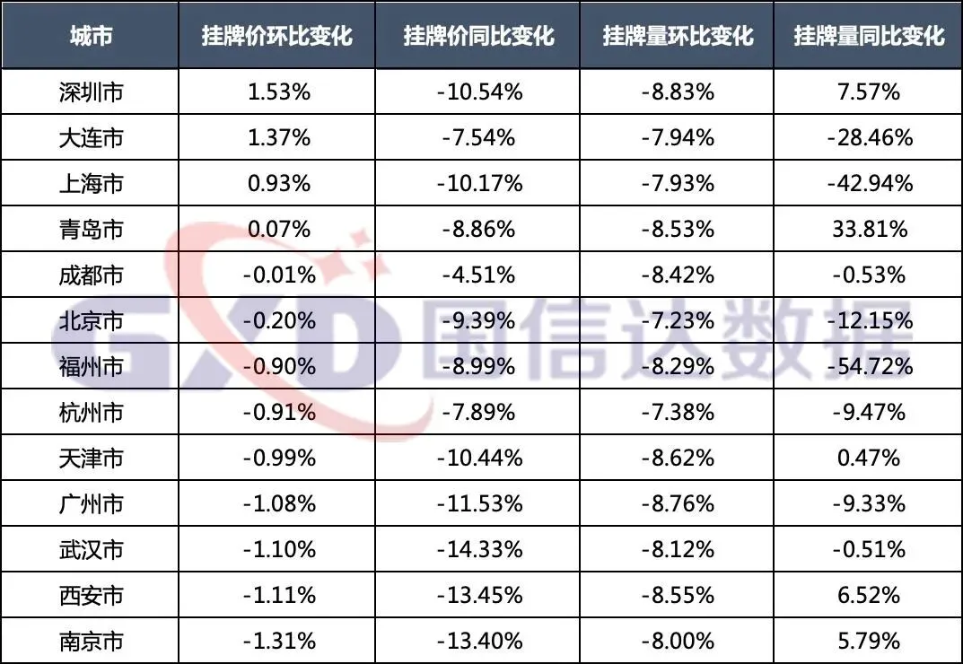 挂牌价指数方面,4个城市挂牌价指数环比上涨,环比涨幅较大的城市是深圳市,13个城市的挂牌价同比均下降,其中降幅较大的3个城市分别为武汉市、西安市、南京市。