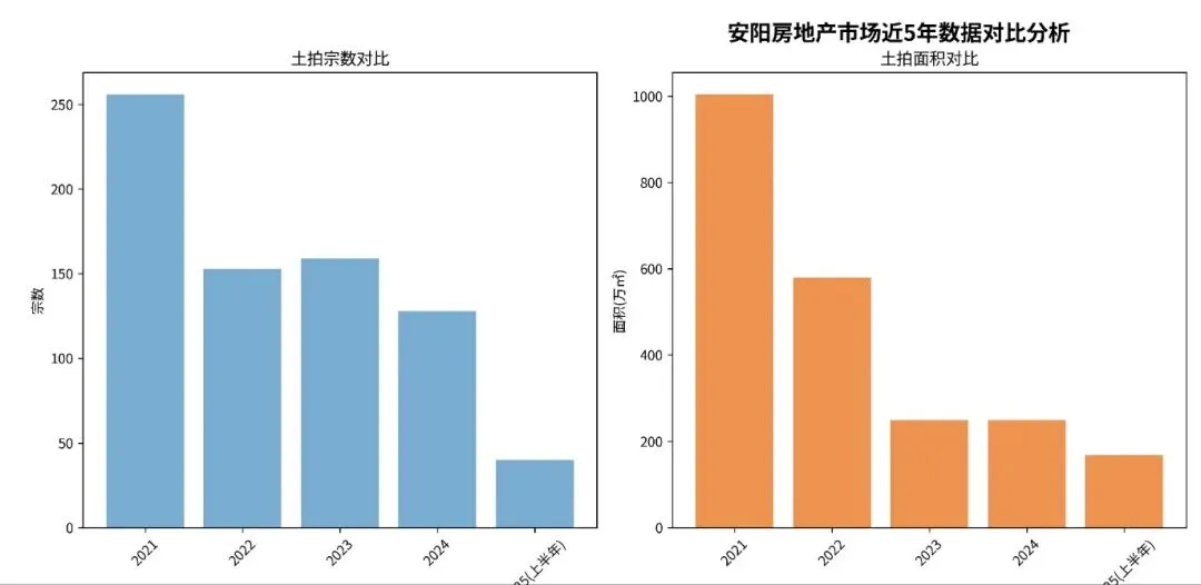 近5年(2021-2025年)安阳的土地拍卖市场经历了从高位回落到企稳回升的调整过程。受房地产市场大环境影响,2022-2024年供应量明显收缩,但2025年市场信心有所恢复,成交量出现反弹,但整体来说,土地供应量与2021年相比明显减少。