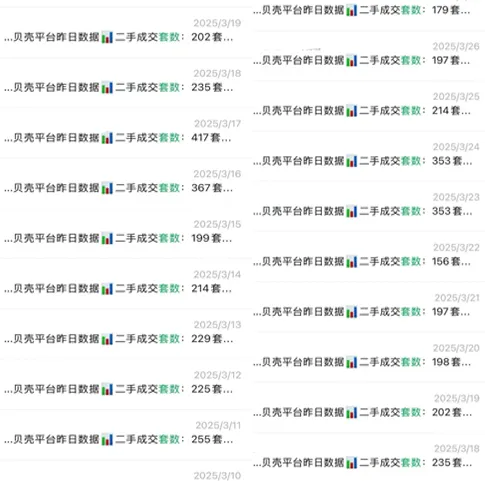 上周六,二手房成交了336套,周日成交了415套。这个数字大家可能没概念。2025年3月份最高点出现在3月17日的周日,单日成交了417套,周六成交了367套。2024年的3月份最高日成交出现在3月18日,单日成交367套,周六成交了324套。