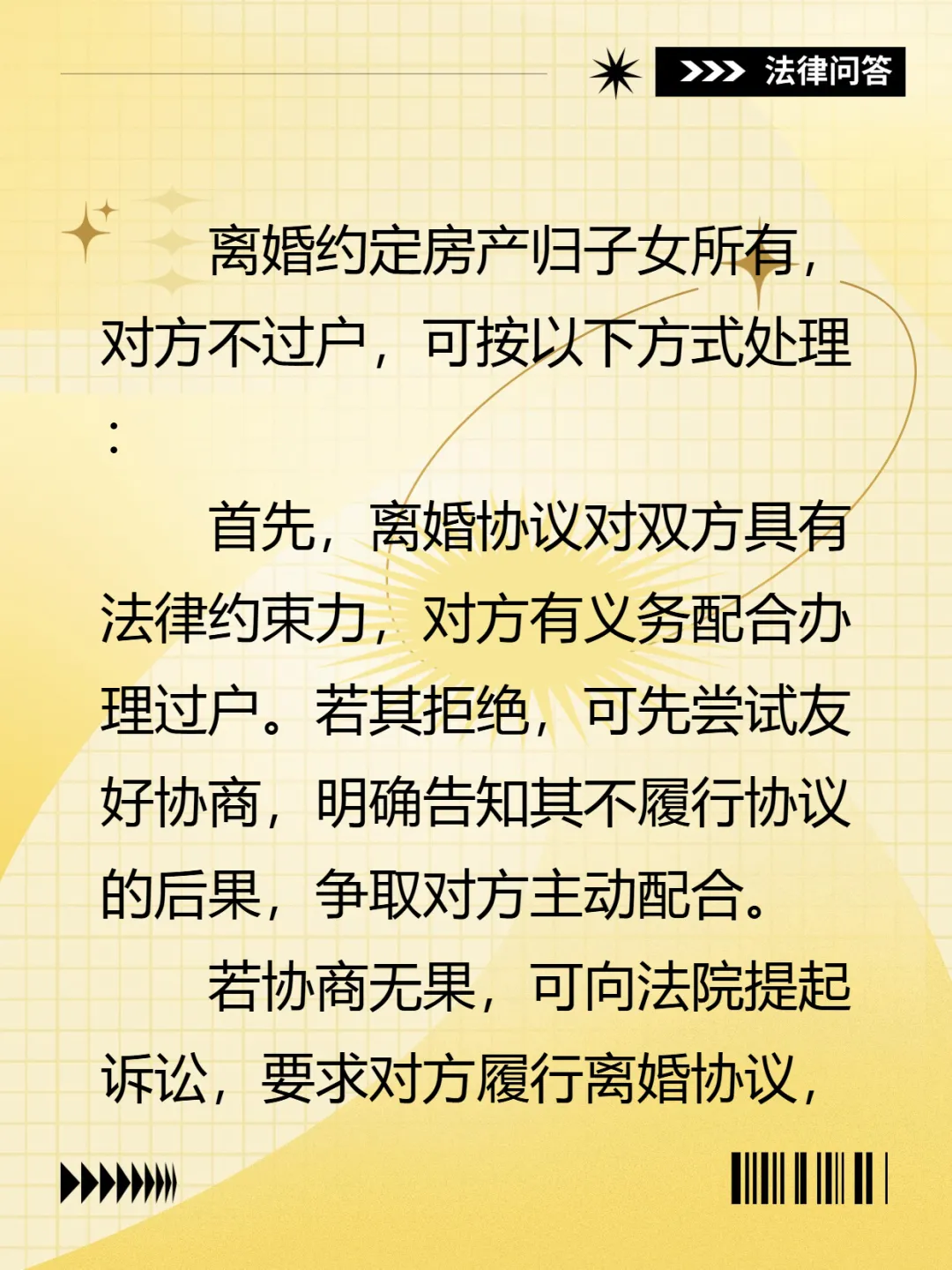离婚约定房产归子女所有,对方不过户,可按以下方式处理: