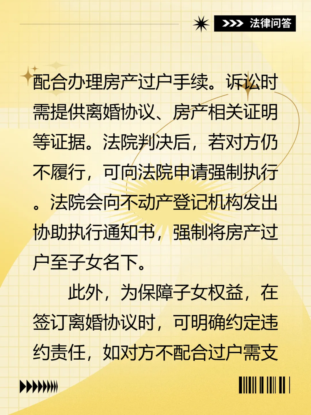 若协商无果,可向法院提起诉讼,要求对方履行离婚协议,配合办理房产过户手续。诉讼时需提供离婚协议、房产相关证明等证据。法院判决后,若对方仍不履行,可向法院申请强制执行。法院会向不动产登记机构发出协助执行通知书,强制将房产过户至子女名下。