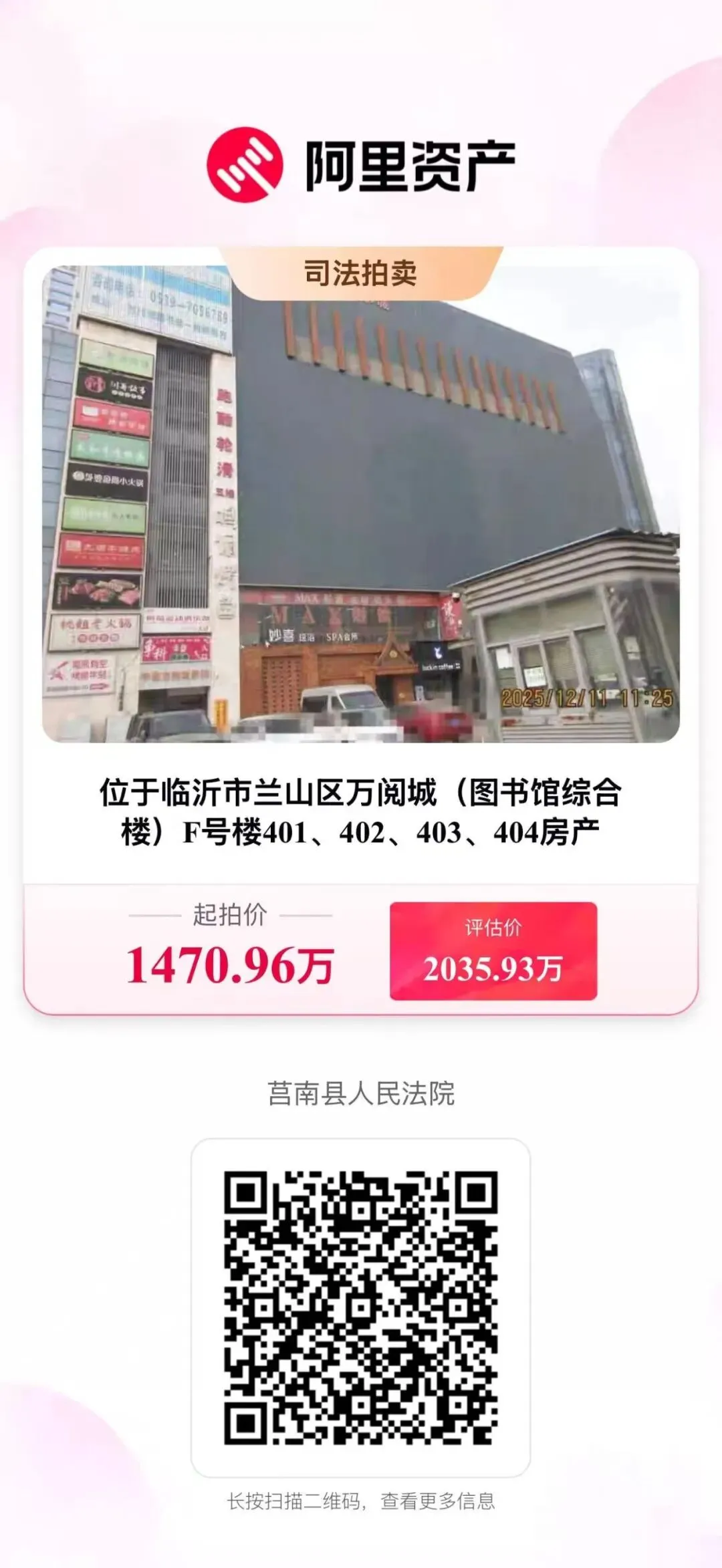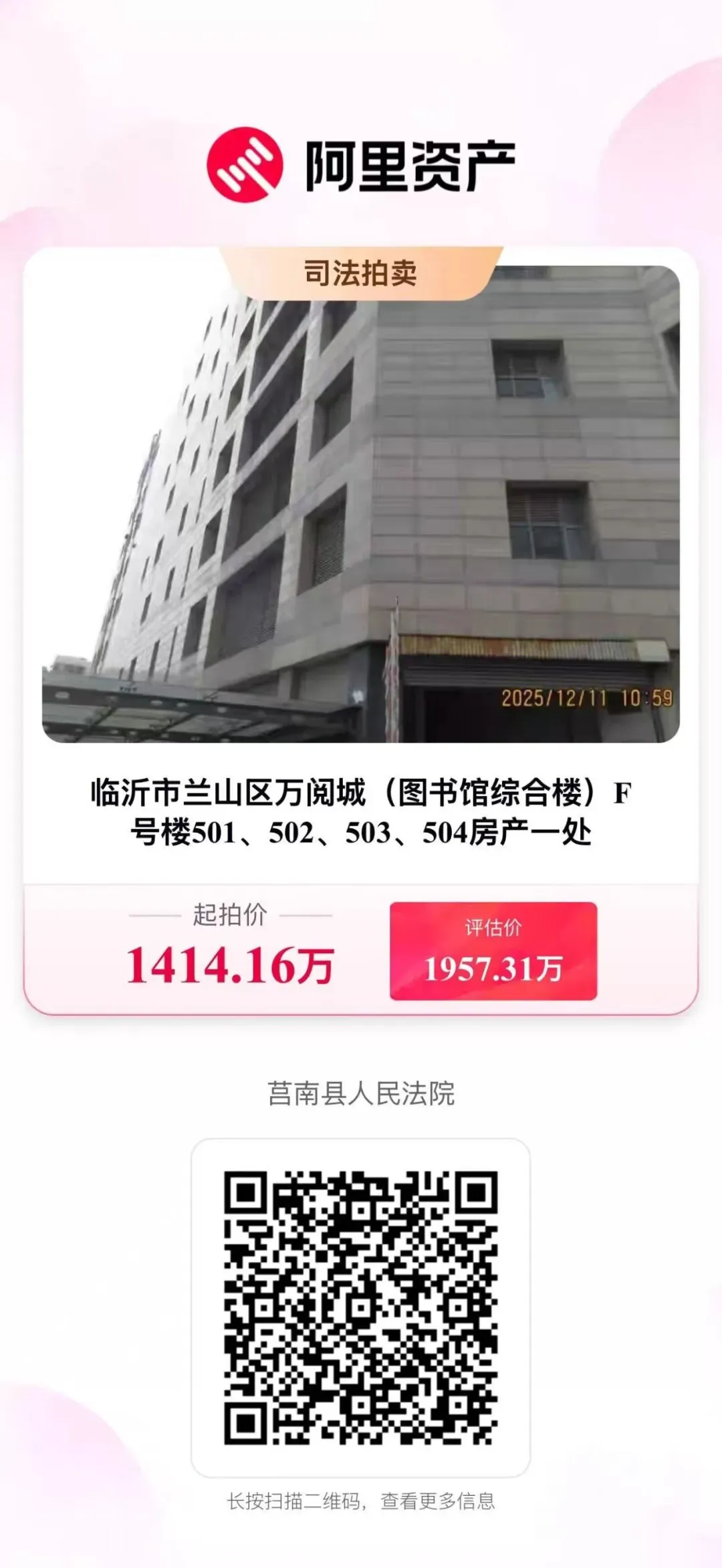 2.拍品名称:位于临沂市兰山区万阅城(图书馆综合楼)F号楼401、402、403、404房产