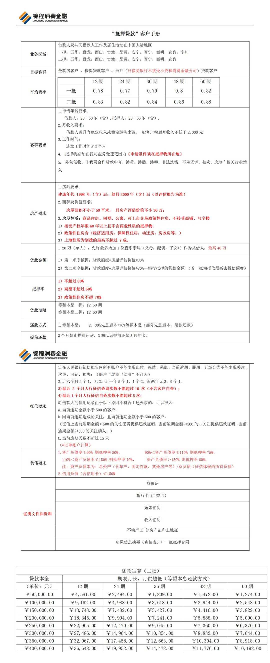 五华,盘龙,西山,官渡,呈贡,安宁,晋宁,嵩明,宜良,东川;二押可做区域:五华,盘龙,西山,官渡,呈贡,安宁,晋宁,嵩明,宜良。负债几乎不看,离婚不需要析产可以直接做,查询一月5次,2月10次。下面是锦程房抵一押二押的产品大纲