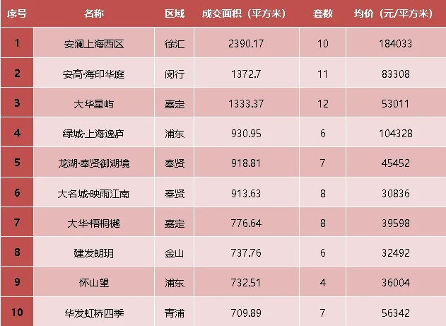 从成交结构看,中高价位项目率先复苏。上周成交榜单前十中,有两个10万+高端项目上榜:“地王项目”安澜上海网签10套,均价18.10万元/平方米;绿城上海逸庐成交6套,均价10.43万元/平方米。改善类项目恢复势头明显优于刚需盘,市场修复呈现结构性分化特征。
