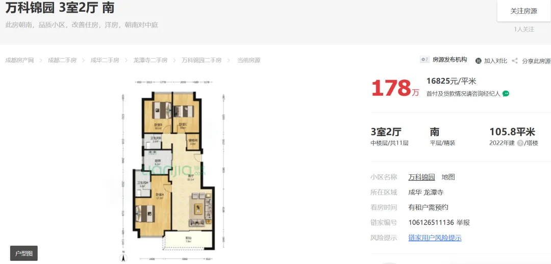 2026年03月07日,据市场端消息:成都成华龙潭寺,万科锦园建面106平套三报价178万;目前房东心里价在178万愿意出售。