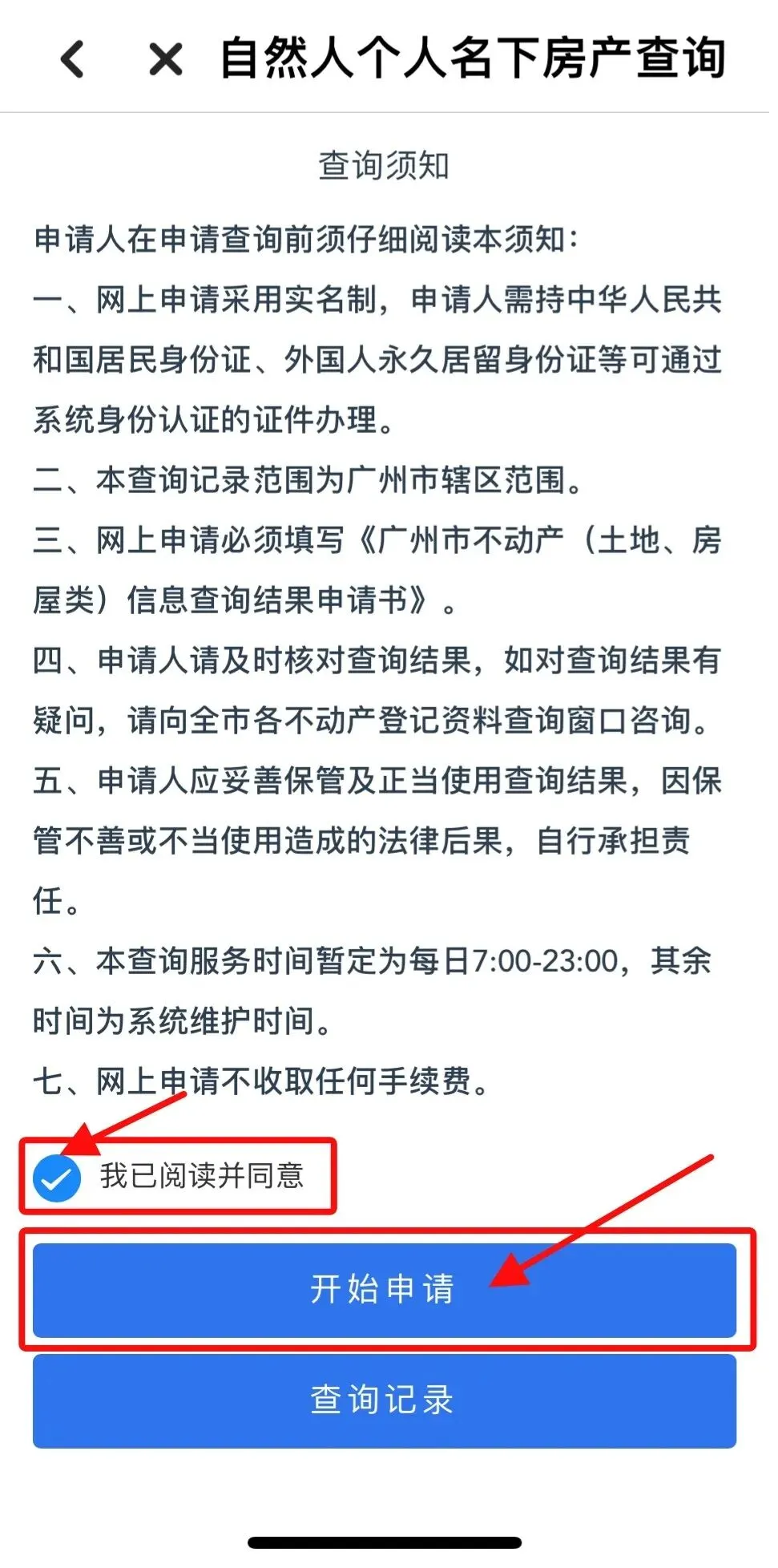 2.阅读“查询须知”,并勾选“我已阅读并同意”后点击“开始申请”,查询前需微警人脸认证。