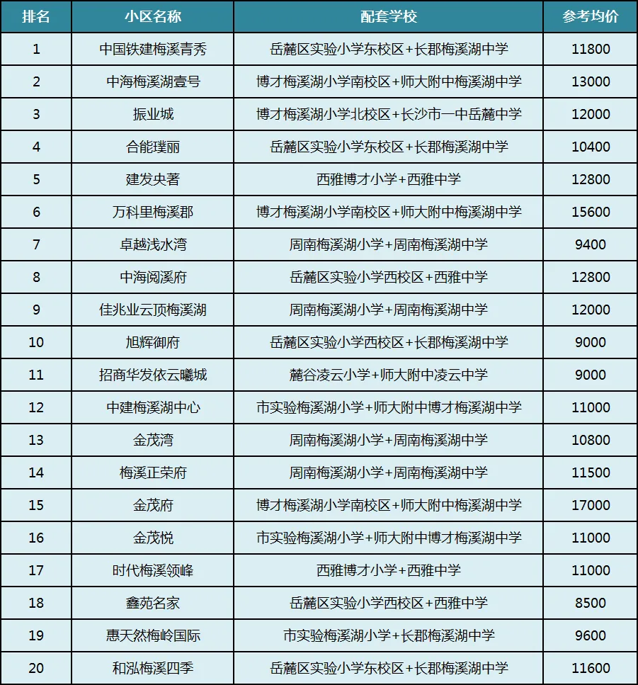 不少次新小区也在榜单上,建发央著、时代梅溪领峰、中海阅溪府,都是配套西雅,均价1.1-1.2万+,另外还有招商华发依云曦城,在梅溪湖二期,均价才9千。