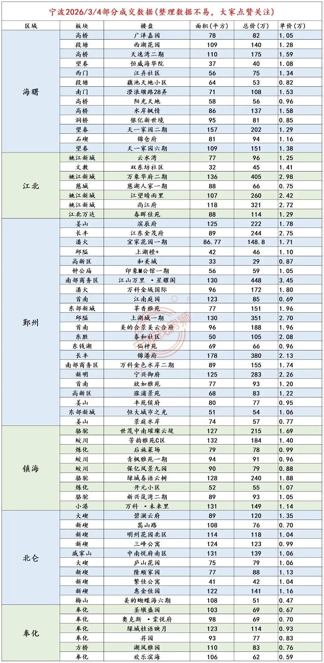 >3月4日宁波二手房成交价格