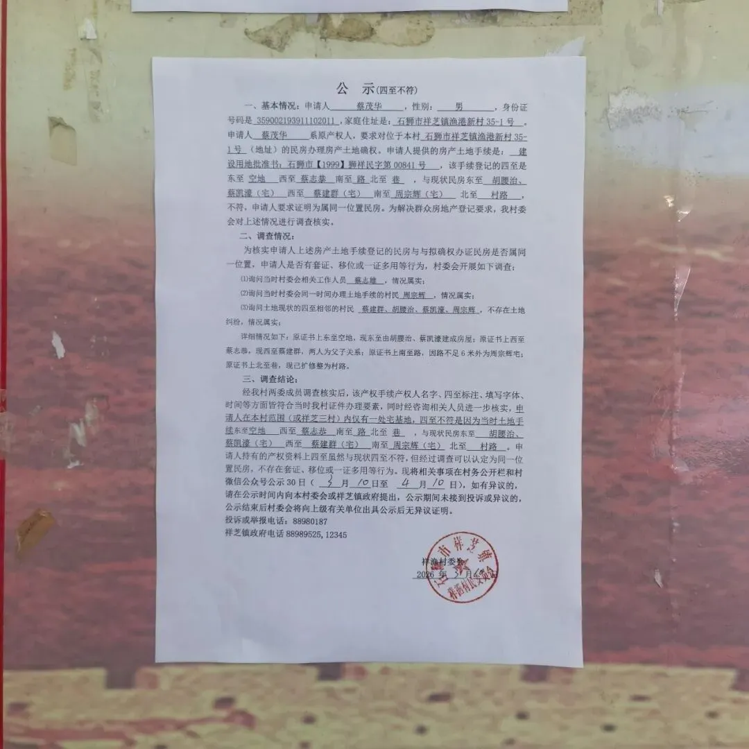 【公示】土地房产手续四至与现状民房四至不符公示(蔡茂华)