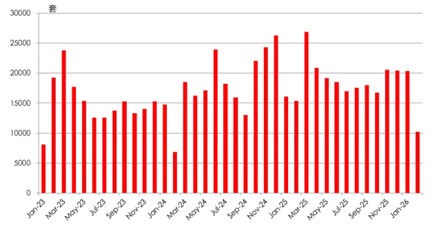受春节假期影响,2月上海二手房成交迎来常规回落,据上海中原地产数据,2026年2月全市二手住宅成交1.02万套,环比减少49.74%,近乎腰斩,符合春节淡季规律。