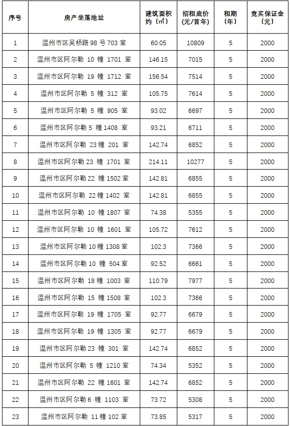 受委托,定于2026年2月28日10时至2026年3月30日10时止(延时除外),对23间房产租赁权在淘宝资产处置网络平台上 【网址:https://zc-paimai.taobao.com/;户名:温州开诚拍卖有限公司】进行网络增价式公开竞价,现公告如下: