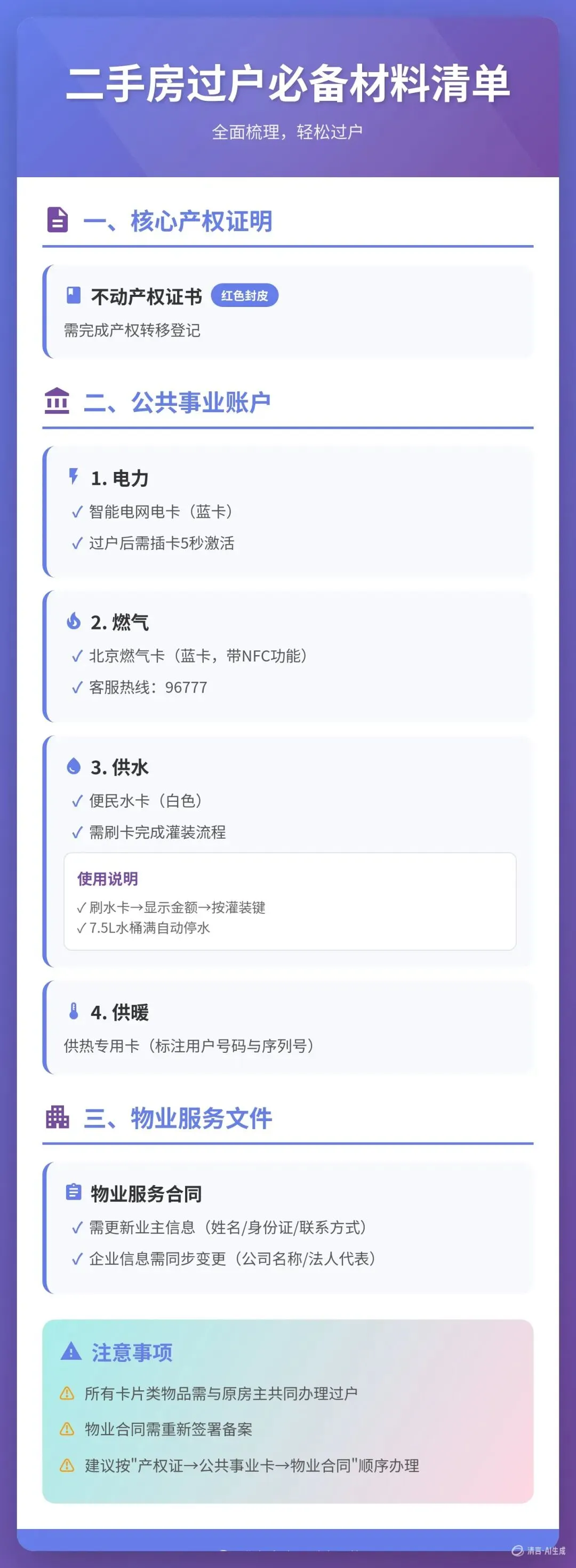 - 建议按"产权证→公共事业卡→物业合同"顺序办理