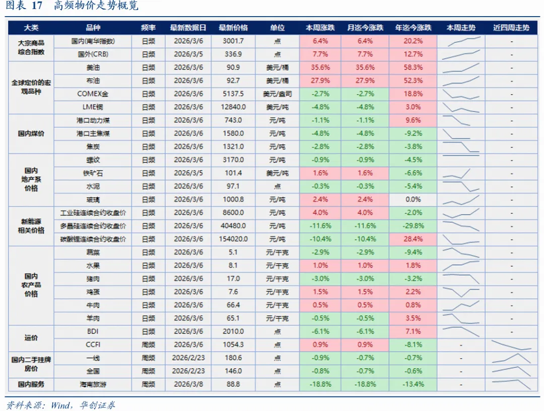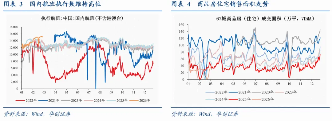 服务消费:出行数据平稳。3月第一周,国内航班执行数较去年+18%,环比上月回落5个点。2月全月,航班执行数较去年同期+7.8%。3月前6日,26城地铁客运人数基本持平去年。