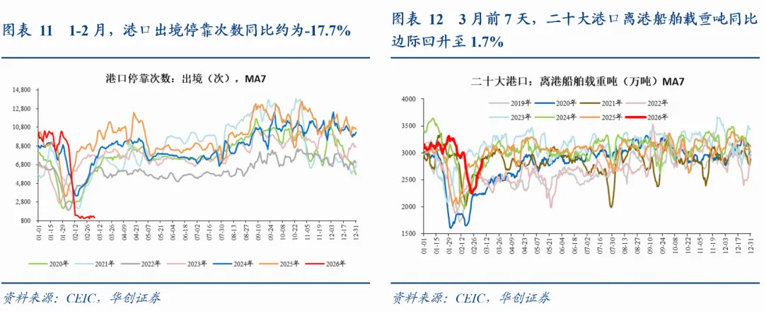 中国出口量:①港口集装箱吞吐量同比边际回落。截至3月1日当周,我国港口集装箱吞吐量环比+6.4%,上周为-13.6%,九周累计同比边际回落至12.4%,上周为13.2%,去年12月底四周同比为7.2%。②二十大港口离港船舶载重吨同比边际回落。今年截至3月7日,二十大港口离港船舶载重吨累计同比8.4%(1-2月累计同比为9.2%),去年12月为-1.6%。③港口出境停靠次数同比边际回落。今年截至3月5日,港口出境停靠次数累计同比-18.9%,低于1-2月累计同比-12.6%。